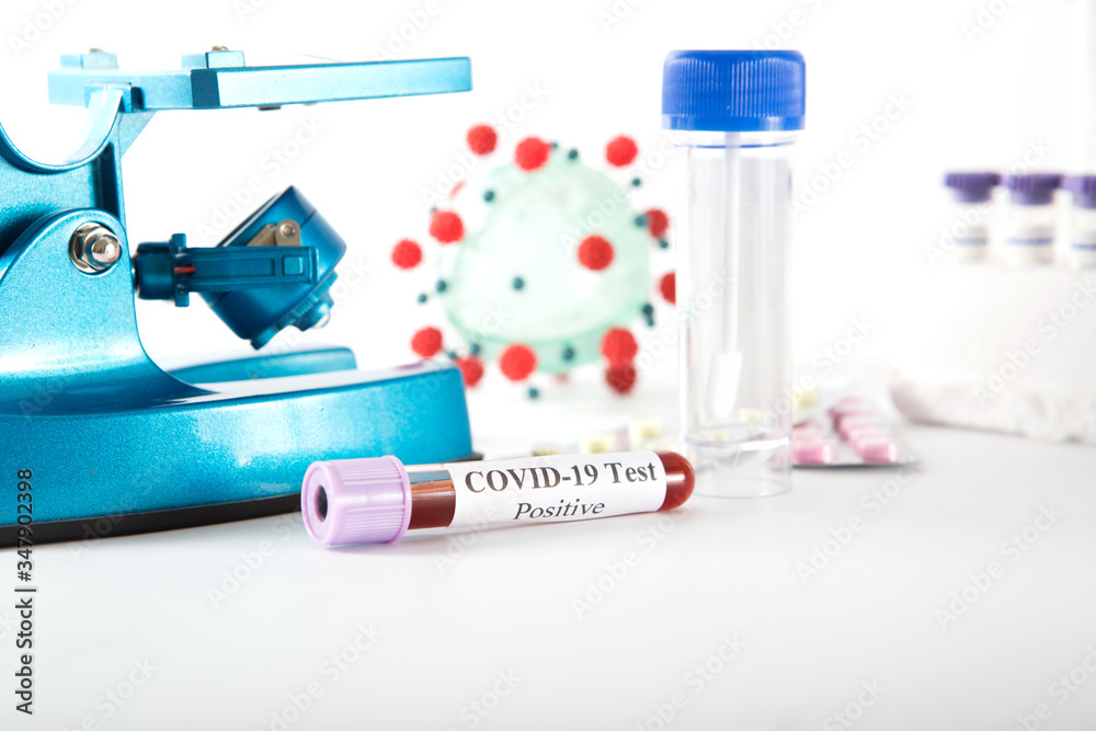Test tube with a positive COVID-19 test on a white background