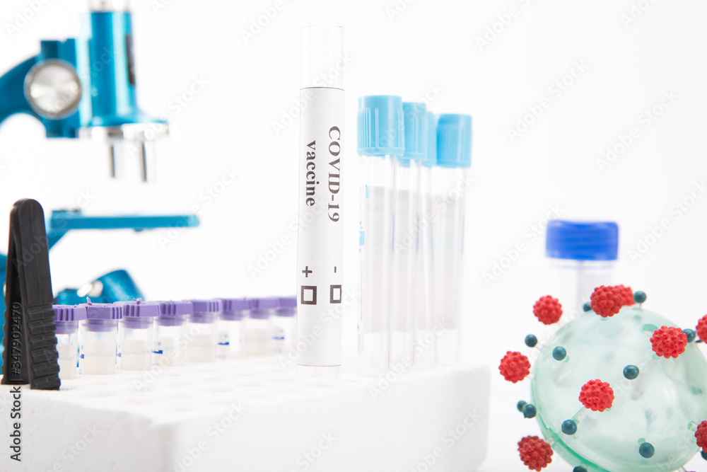 Test tube with a vaccine against coronovirus infection COVID-19 on a white background