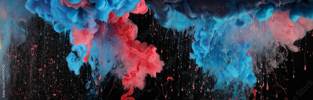 Acrylic colors and ink in black water. Ink blot. Abstract background. Horizontal long banner.