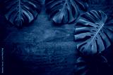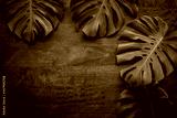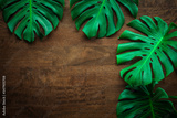 Monstera leaf top view philodendron leaf pattern on old wooden table background, copy space