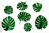 set of green monstera tropical plant leaf on white background for design elements, Flat lay