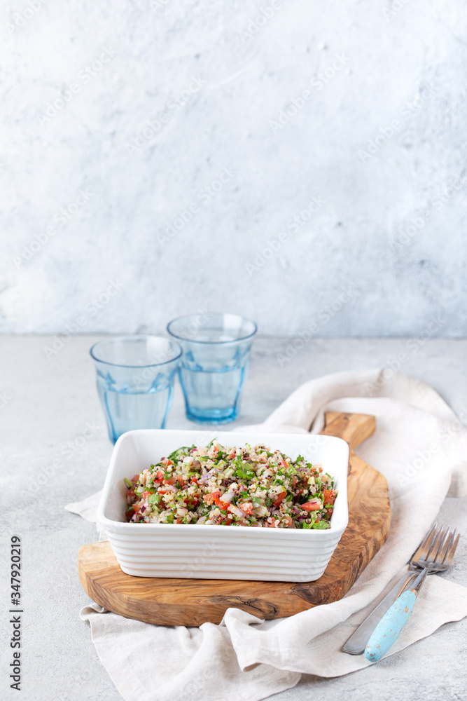 Quinoa Quinua salad with tomatoes and herbs in white bowl