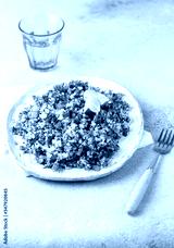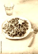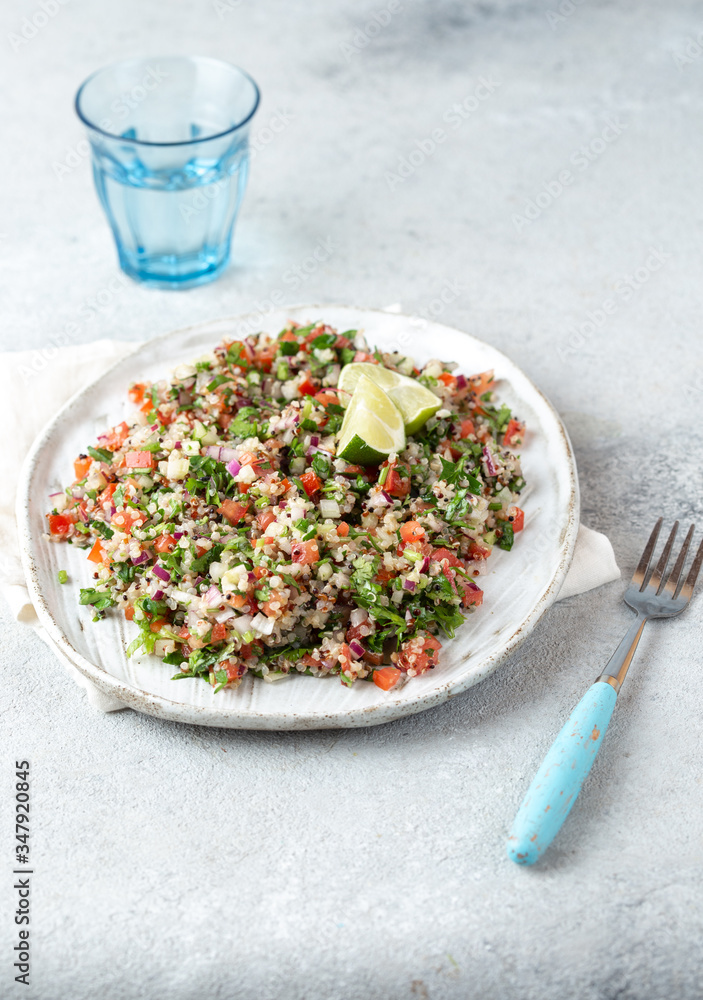 Quinoa Quinua salad with tomatoes and herbs in white bowl