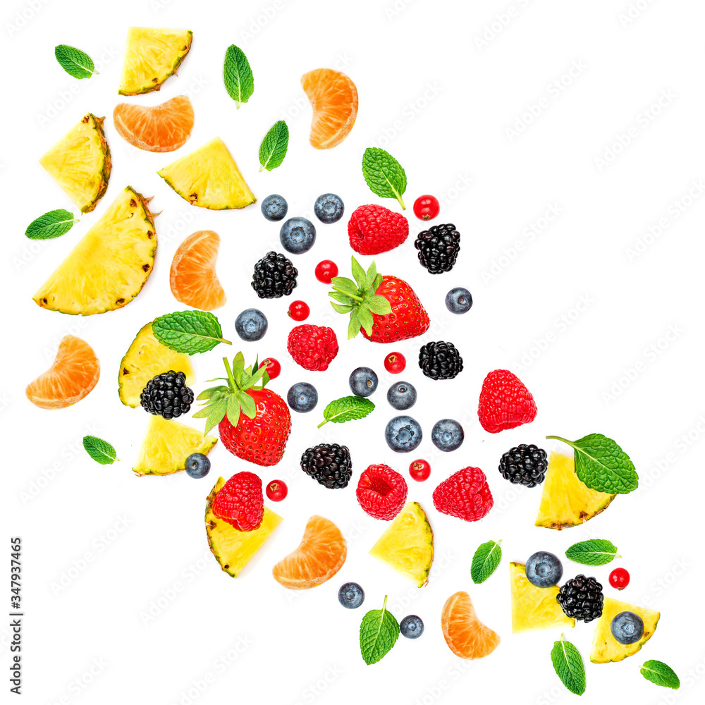 Summer Pattern with Slices of Pineapple Isolated. Exotic fruit Pineapple pieces with green mint leaves on white background. Flat lay.