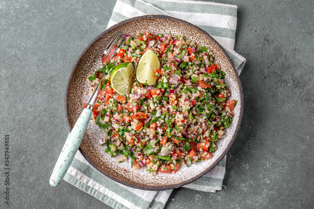 Traditional Lebanese salad tabouli tabule with quinoa, herbs, tomatoes, mint and lemon