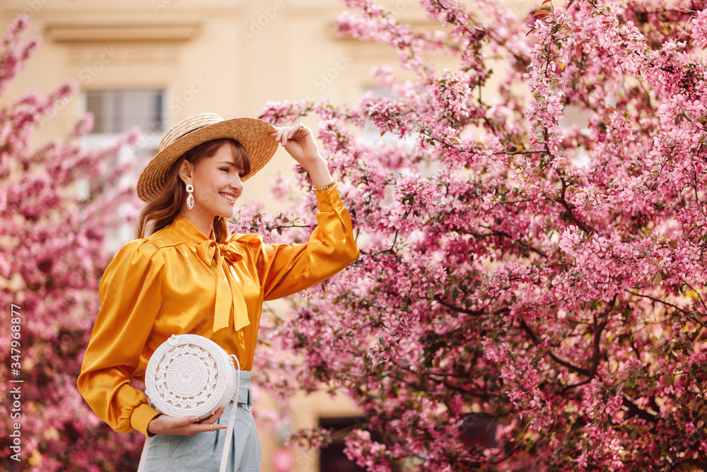 Happy smiling woman wearing trendy wide brim straw hat, yellow vintage blouse, holding round wicker rotang bag, posing, walking in street near pink spring blossom trees. Copy, empty space for text