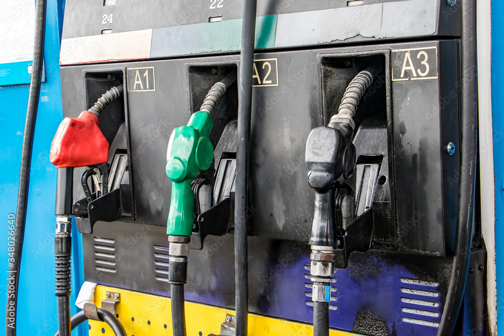 A gas station, close up.The detailed view of the handle of the pistol from the fuel pump.