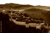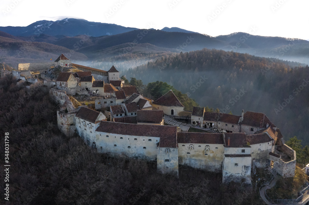Aerial drone panoramic view of Historical fortress in Risnov or Rasnov. Romania