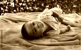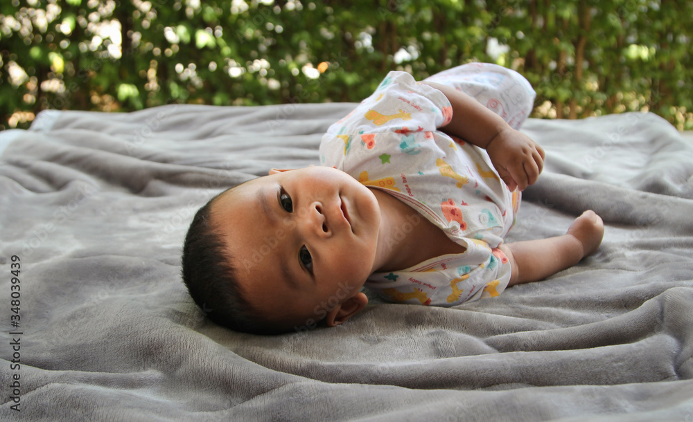 Southeast Asian newborn baby. Crawling in the house. Kid is cute. Child is taking photo indoor. Infant is 5 months. - People, Health care concept.