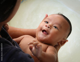 The baby showered her hair with the mother bathing baby. The baby looked at the mother with the beloved eyes.