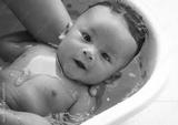 The baby showered her hair with the mother bathing baby. The baby looked at the mother with the beloved eyes.