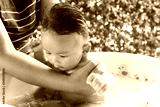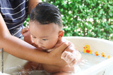 The baby showered her hair with the mother bathing baby. The baby looked at the mother with the beloved eyes.