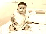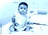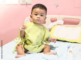 Southeast Asian boy, 6 months old. Illness sick, right hand has injection Was lying in the hospital gown. On the hospital bed. Focus on the right hand That has a syringe.