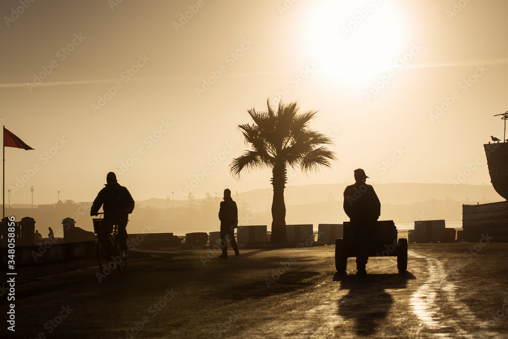 Silhouette of a man pushing his trolley on the african seashore, with beautiful clouds in the background