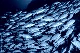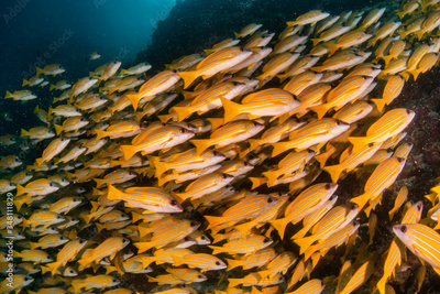 School of yellow snappers swimming together among the reef