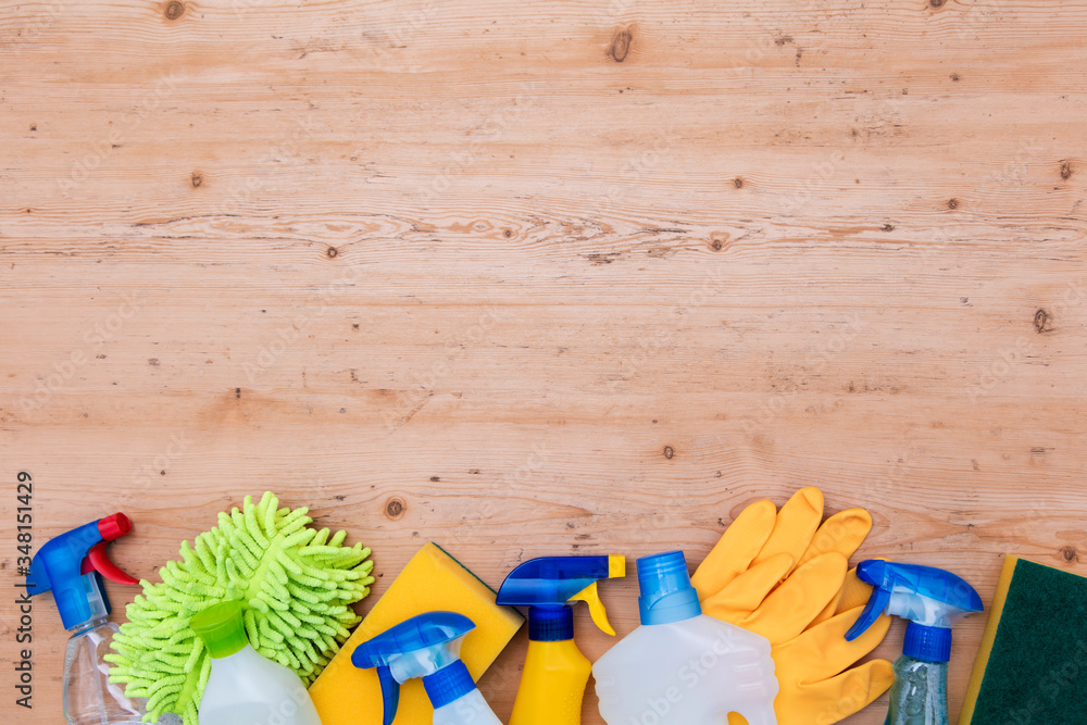 Cleaning spray bottles and cloth lay flat composition on a wooden background