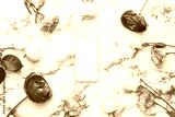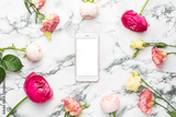 Mobile phone, Ranunculi pink flower and white flower bouquet on marble background