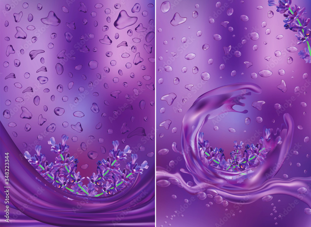 Violet lavender with drops water. Aroma lavender. Bunch fragrant lavender. Flower perfume water. 3d illustration.