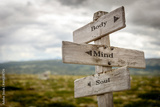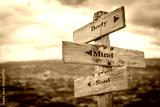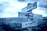 body mind soul text engraved on old wooden signpost outdoors in nature. Quotes, words and illustration concept.