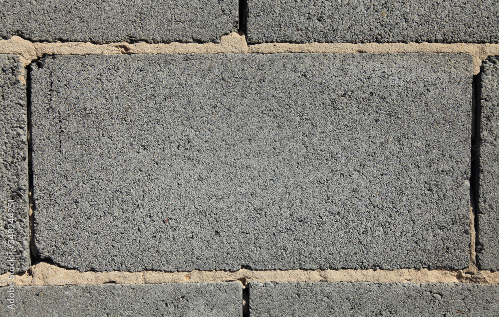 Grey brick, texture and background. Surface and blank for inscription. Mock-up. Slag (cinder) block or expanded brickwork. Slag bricks in building for light but non-residential premises