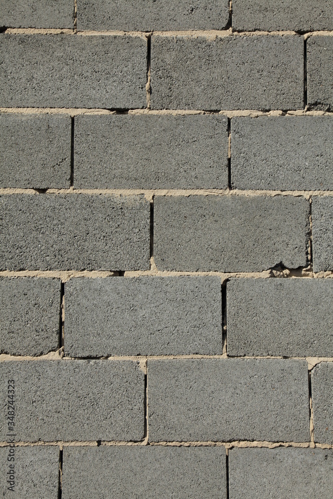 Slag (cinder) blocks or expanded brickwork. Grey wall, texture and background. Slag bricks in building for light but non-residential premises. Old-fashion exterior. Vertical view