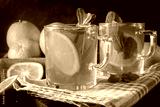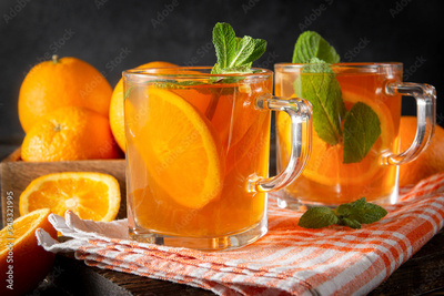 tea with orange and mint, fresh oranges on a towel on a dark wooden background