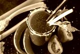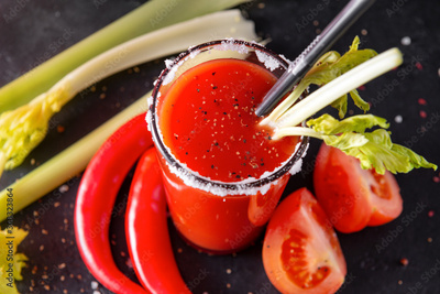 1 glass of tomato juice with fresh tomatoes, celery, salt , cocktail tubes , chili pepper on a black