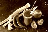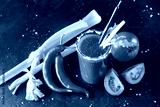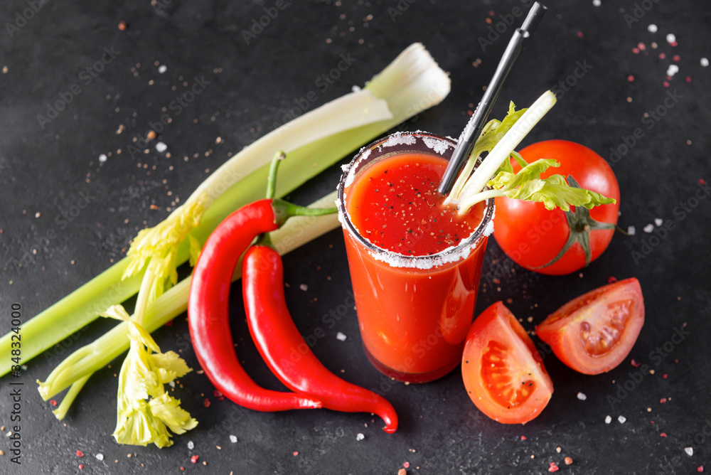 glass of tomato juice with fresh tomatoes, celery, salt , cocktail tubes , chili pepper