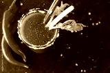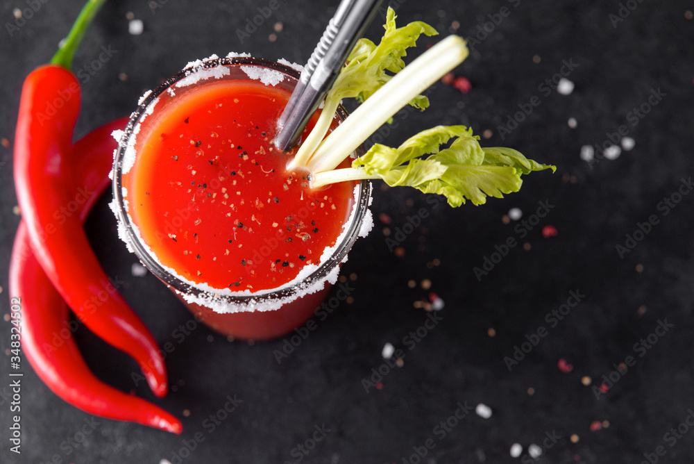 glass of tomato juice with spices , salt , chili pepper , cocktail tubes on a black background, top view, bloody Mary