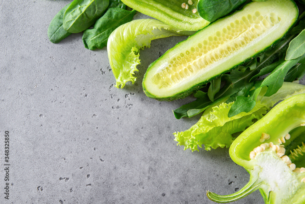 green sprigs of fresh lettuce, arugula, cucumber, pepper on a gray
