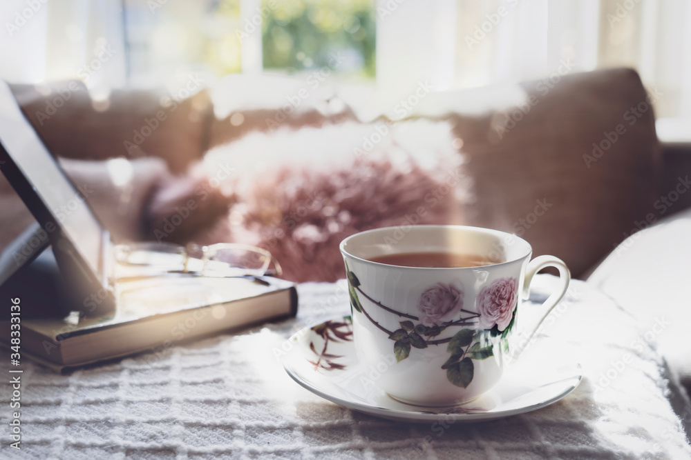 Hight key light tea cup on coffee table with sunlight shining thought from window, Still life Hot tea with steam and blurry tablet with morning light or Can be Cozy scene of relaxing in afternoon tea