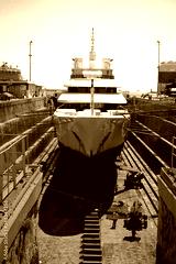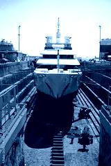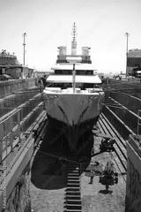 Photo of ship repairs of yacht in hull in shipyard floating dry dock