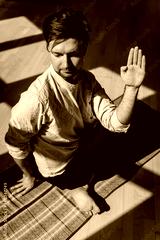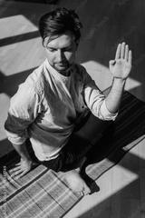 Man practice yoga. Young attractive male doing breathing exercises. Guy meditating at home along during the pandemic. Relaxation and resting concept for isolation. Slide shot.