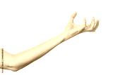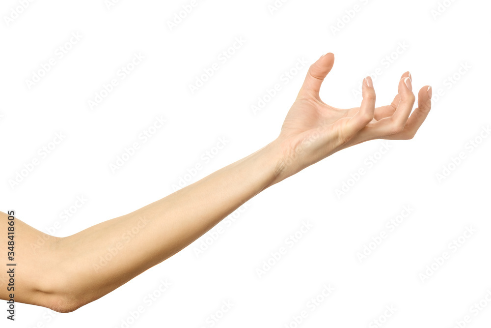 Giving, reaching or holding hand. Woman hand gesturing isolated on white