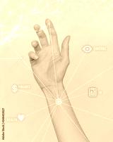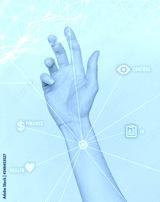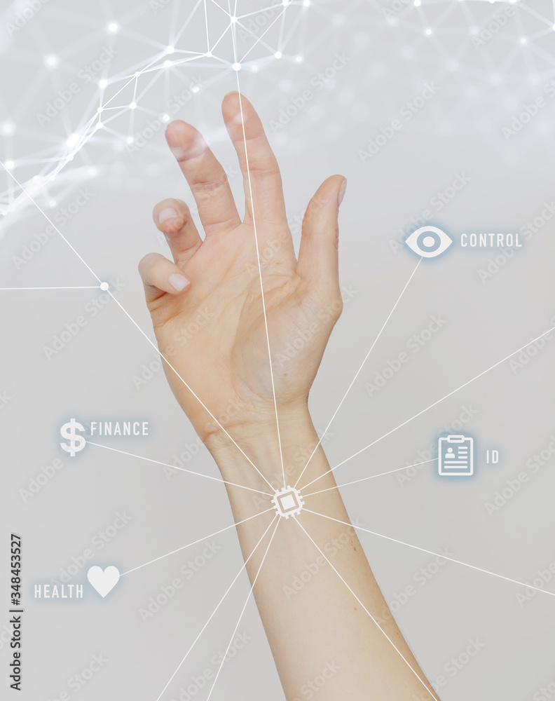 Human Chipping, Multi passport, Identification, Digitalization and Vaccination Concept. Hand With Implanted Chip Containing Information About Finances, Health, Personal ID And Social Rating