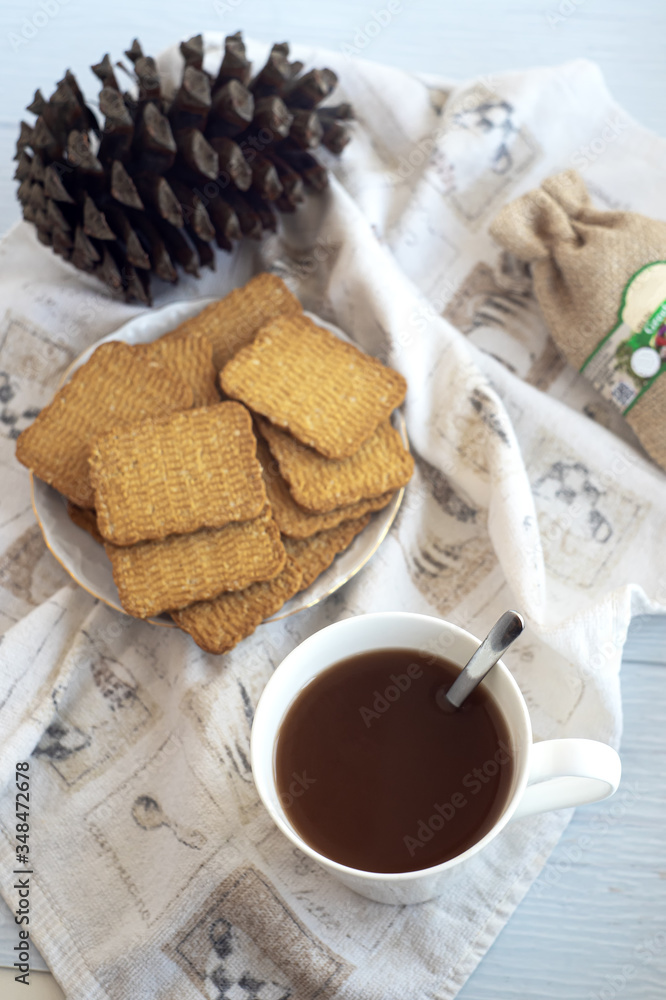Coffee, cookies and a pine cone on the table, Breakfast.