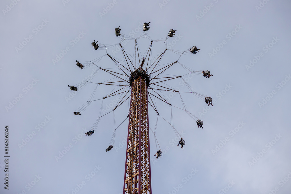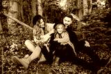 Stylish family in the autumn forest. A young guy and a girl are sitting on yellow leaves near a wooden fence with their daughter.