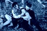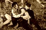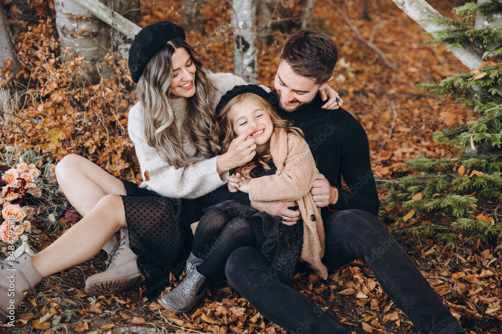 Stylish family in the autumn forest. A young guy and a girl are sitting on yellow leaves near a wooden fence with their daughter.
