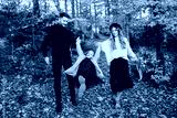 Stylish family in the autumn forest. A young guy and a girl are walking along a forest road among yellow leaves with their daughter.