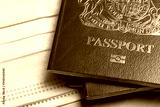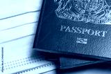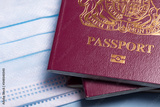 British travel passport with a protective face mask. Coronavirus travel concept
