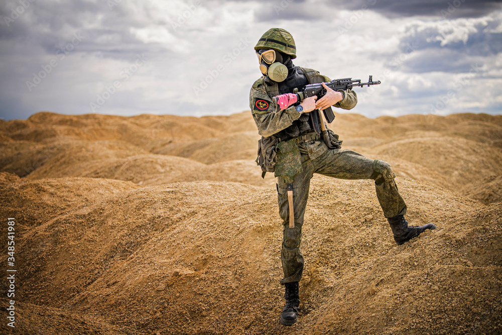 military man in a gas mask with a weapon stands in the middle of the desert