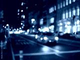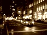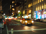 Defocus blur of New York City street scene at night with yellow taxi cabs, cars, lights and buildings.