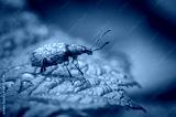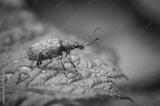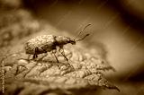 A Golden-colored beetle with a long mustache sits on a green leaf in the garden, macro photography