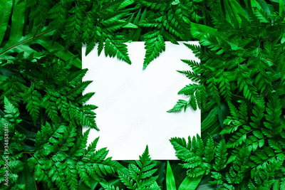 tropical green leaves and palms with white paper note frame, nature flat lay concept