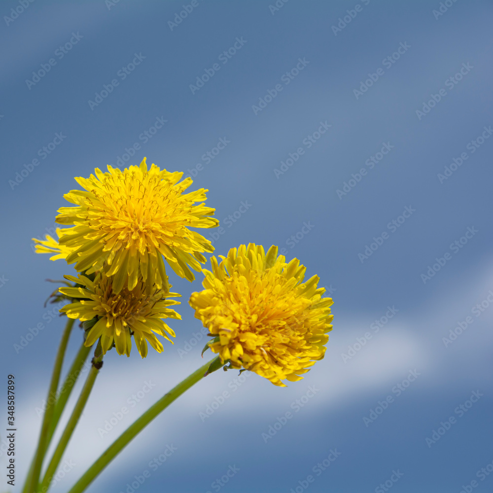 dandelion flowers against the blue sky, close-up