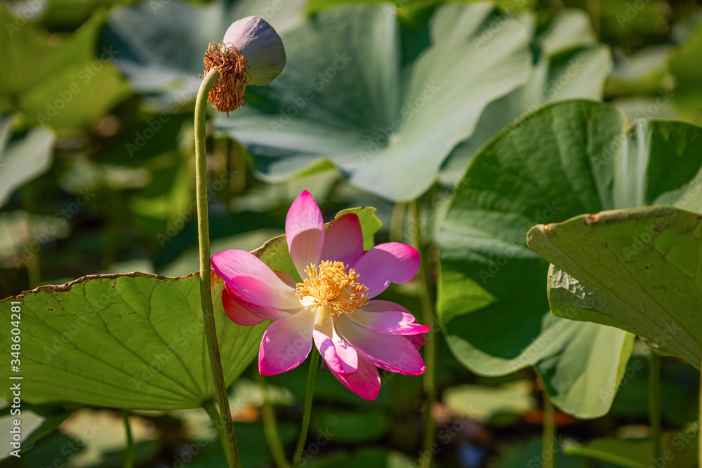 Beautiful pink Lotus flowers in a natural pond in the morning summer sun.