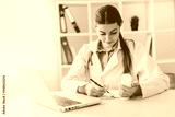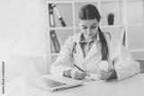 Smiling young female doctor working at the clinic , she is using a computer and writing medical reports.