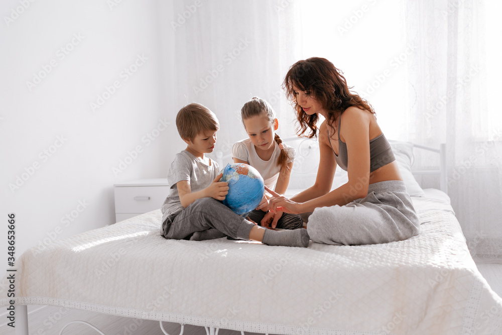 Happy family mother, daughter and son are playing with a terrestrial globe at home in bedroom. Stay home and homeconcept.
