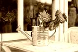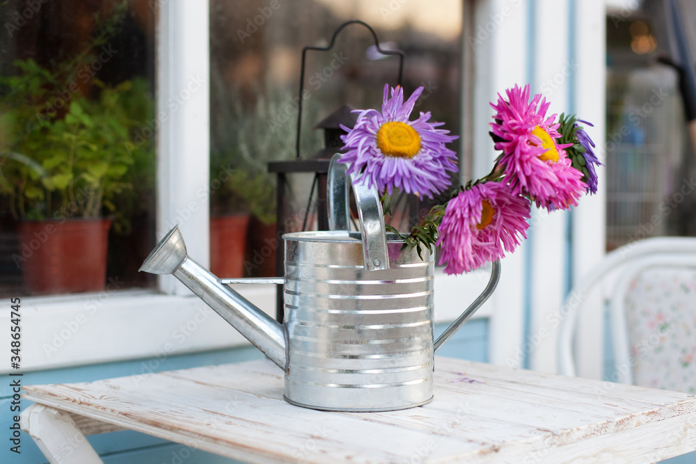 Wildflowers in watering cans on white table in garden. Gardening tools, houseplants and flowers on terrace. Concept of gardening and hobby. Bouquet summer flowers in metal watering can on veranda.