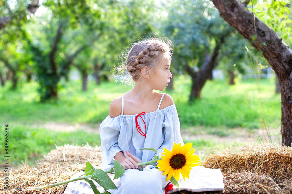 Little girl with pigtail on her head sits on roll of haystacks in garden and holds sunflower. Child sits on straw and enjoys nature in countryside. Childhood concept. Child is sad. Loneliness. Pensive